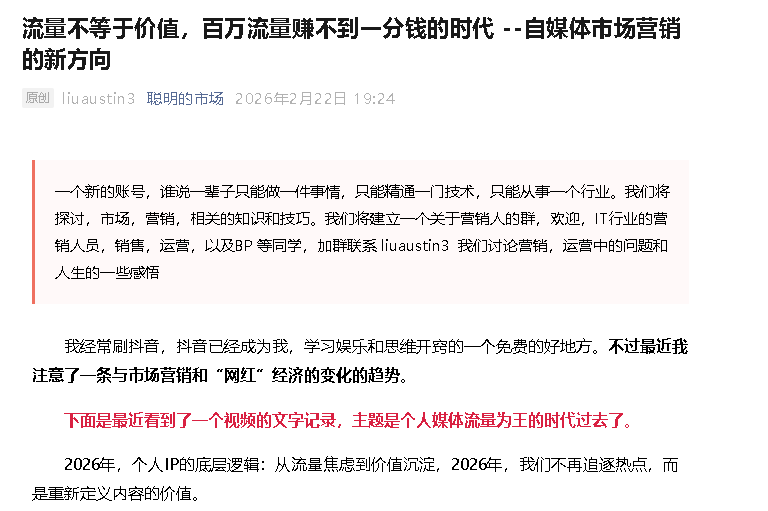 2026年过年期间,刷到了一条视频。其中核心的思想是自媒体的2026年如何继续操作,其中有一条核心的思想,利他的持久价值。其中的内容我已经整理好内容在另一个号发了。