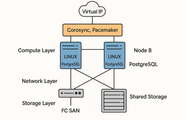 计算层: 两台物理服务器,安装同样的LINUX,Corosync,Pacemaker,两台机器的postgresql.conf ,pg_hba.conf 完全一致,且数据库目录指向同一个挂载点。通过网络层,FC SAN 通过光纤交换机,链接服务器与存储,为了防止单点故障,通常会有两条链路,实现冗余。存储层上,对于两台服务器同时可见,但同一个时间只能一台机器挂载。