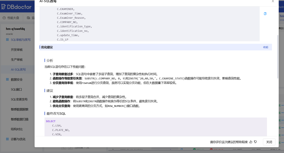 结论:DBdoctor在数据库性能管理与运维管理,SQL审核审计均提供相关功能,在测试中能有效及时发现数据库的问题,本次测试数据库类型包含(MySQL, PostgreSQL),对于提供支持的其他20余种数据库未进行测试。在测试中图形化界面有利于快速熟悉软件操作,通过系统提供的故障深度根因分析,有效协助DBA工作,在AI SQL改写功能测试中SQL改写功能比较完善,有助于快速解决问题。
