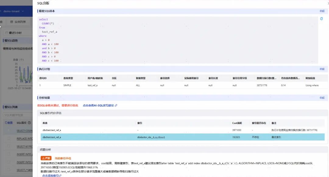 3 慢SQL分析与记录,在DBdoctor软件测试中,对SQL慢查询进行测试,预设的慢查询语句均可以在系统慢查询记录中找到,包含慢SQL发生的时间及当时慢SQL统计与趋势分析,通过系统的深度诊断,展示慢SQL的事例,执行计划,并根据以上信息,给出推荐智能索引,和SQL改写的建议,对慢SQL进行系统化的发现和优化管理。软件中也提供SQL白名单的功能,对一些暂时无法处理的SQL进行标记,避免DBA和开发重复劳动。
