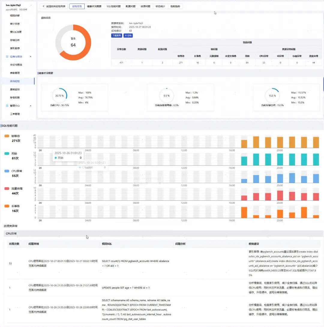 4 运维自治与数据库巡检,相较DBA之前的数据库巡检脚本和开源工具,DBdoctor软件进行实例巡检的速度和效率都有较高的效率提高,速度较快,在自动化情况下,可以针对数据库每天进行一次巡检,对CPU 内存,SQL问题,IO异常,流量徒增问题,以及存储告警等都能及时的进行信息获取,有效降低了数据库事故发生的频率和可能性。