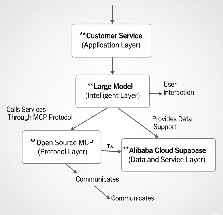 这里画一张简易客户服务-->大模型-->MCP-->SupaBase的关系图