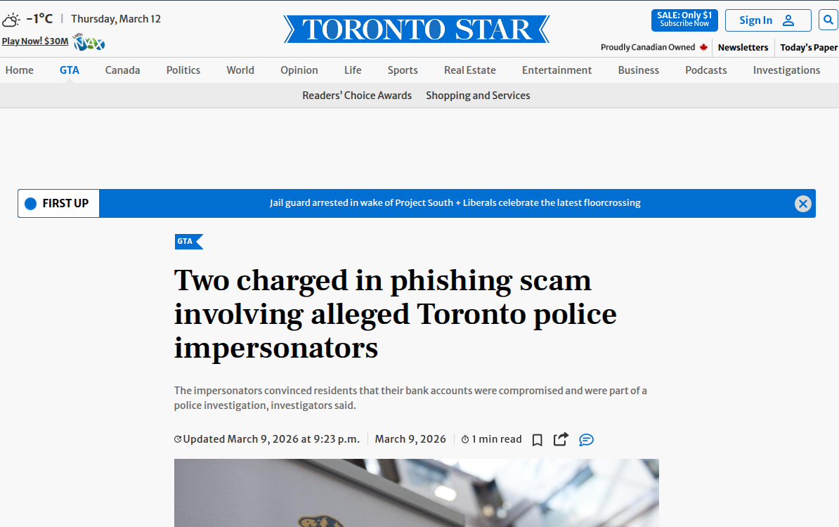 根据媒体报道,两名被告被指控策划并实施了一系列针对多伦多市民的诈骗活动。其核心手法是冒充多伦多警察局的高级警官,通过电话或短信联系受害者,谎称受害者卷入洗钱、贩毒或其他严重刑事案件,要求其配合“秘密调查”并将资金转移至所谓的“安全账户”以证清白。与传统诈骗不同,本案嫌疑人在通信过程中展现出了极高的专业度:他们准确掌握了受害者的部分个人信息,使用的电话号码往往能正确显示为多伦多警察局的官方号码或相关政府机构号码,且话术严谨,熟悉警务流程,极具迷惑性。