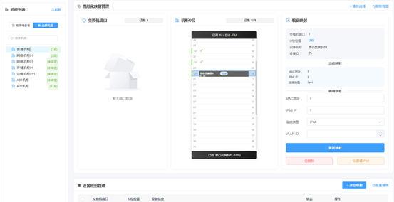 自动化程度 | 高:设备上架 / 下架 / 移位秒级感应、自动同步,无需人工干预 | 中:基础状态自动同步,设备移位需手动调整端口映射,需人工辅助 |
