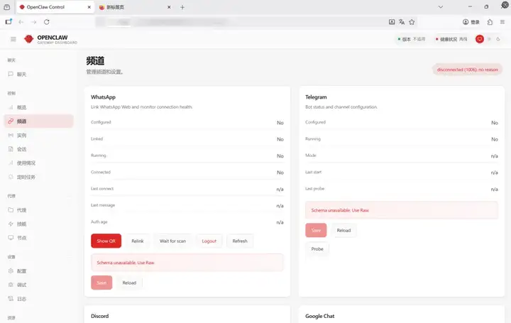Channels 页面,若控制面板裸露在公网,频道状态与配置页也可能被直接访问