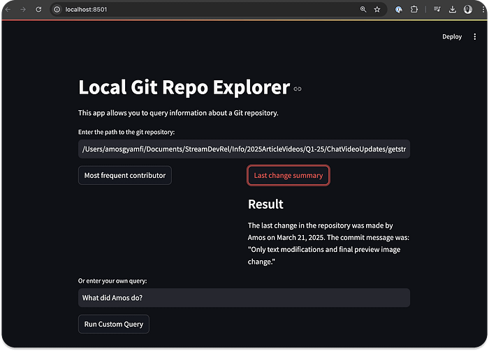 •查询本地 Git 仓库的贡献者信息•获取最后一次提交的变更摘要•支持自定义问题查询