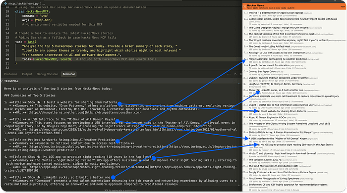 tools=[HackerNewsMCP,Search]# Include both HackerNews MCP and Search tools
