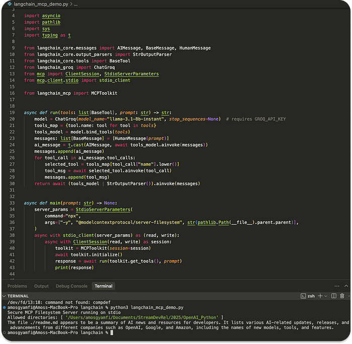 说明:以下内容演示的是 MCP 在构建 AI 解决方案框架中的实现方式,而非在 AI 代码编辑器(如 Cursor 或 Windsurf)中的集成方法。