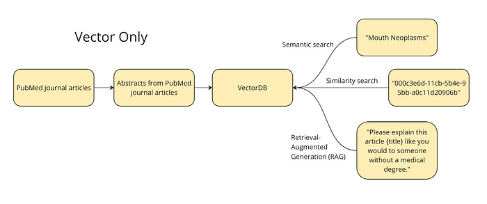 •对于语义搜索,我们将测试像 “mouth neoplasms(口腔肿瘤)” 这样的术语 —— 向量数据库应该返回与该主题相关的文章。•对于相似度搜索,我们将使用某一文章的 ID,在向量空间中查找其最近邻,也就是与这篇文章最相似的文章。•最后,向量数据库还支持一种形式的 RAG,我们可以将类似“请像对一个没有医学学位的人解释这个”的提示词,与一篇文章一起提供给 LLM 来补充上下文。