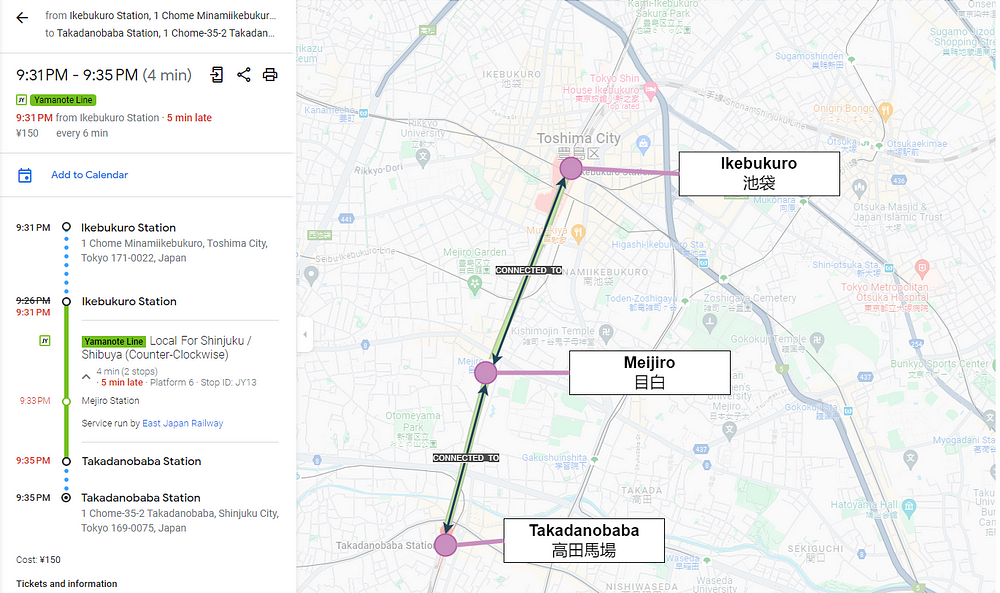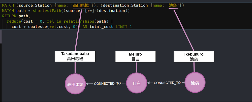 MATCH (source:Station {name: '高田馬場'}), (destination:Station {name: '池袋'})