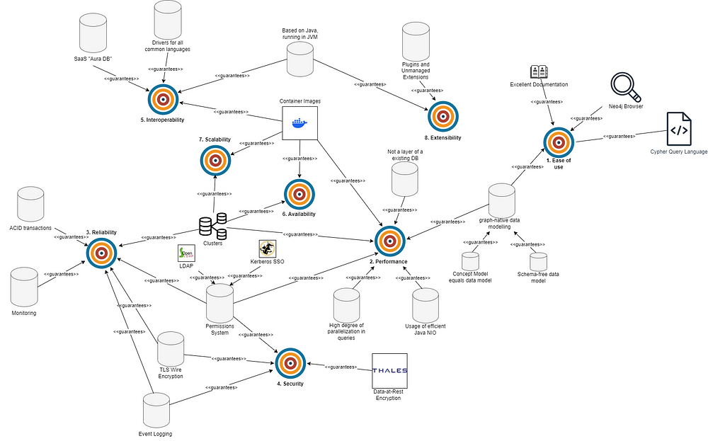 3.🔵 可靠性(Reliability) 对任何数据库平台来说,可靠性都至关重要。Neo4j 通过 ACID 事务、监控、事件日志记录、TLS 数据加密传输及权限系统等机制保障可靠性。4.🟣 安全性(Security) 涉及数据时,安全性尤为重要。Neo4j 通过事件日志、TLS 加密传输、细粒度权限控制和静态数据加密等方式实现安全保障。5.🟡 互操作性(Interoperability) 能够运行于所有相关目标系统,易于集成进现有环境,支持多种客户端进行数据访问。6.🔴 可用性(Availability) 支持集群部署,提升系统可用性,以满足企业级应用需求。7.🟤 可扩展性(Scalability) 支持水平与垂直扩展,能够处理不断增长的数据量和查询负载。8.⚪ 可扩展性(Extensibility) Neo4j 的核心开发团队与外部社区开发者都能轻松扩展该解决方案,无论是修改现有组件还是添加新功能。Neo4j 对新技术与方法论趋势保持开放态度。