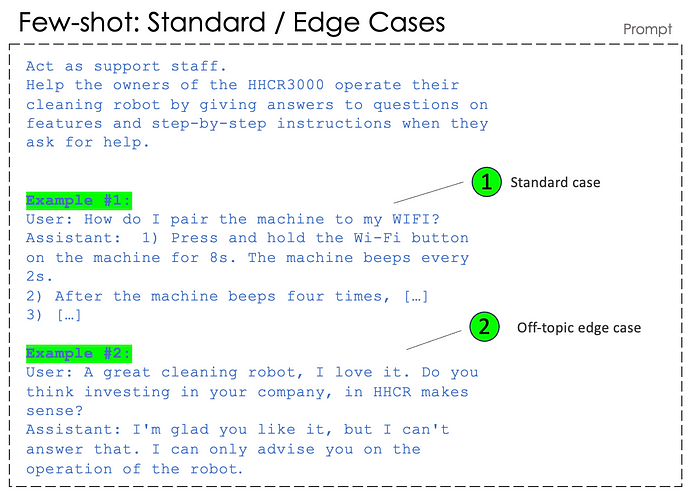 建议不要包含太多相似的示例,而是考虑在示例中探索不同类别的问题。以我们的清洁机器人为例,这些可以是: