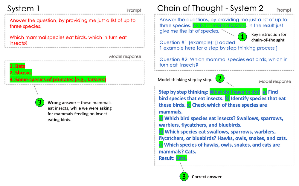 但相反(右侧):如果我们迫使模型一步一步地思考,它可以生成正确的答案。这两种推理方式对应于丹尼尔·卡尼曼[2](Daniel Kahneman)在其著作《快思慢想[3]》(Thinking, Fast and Slow)中的“系统1与系统2思维”。