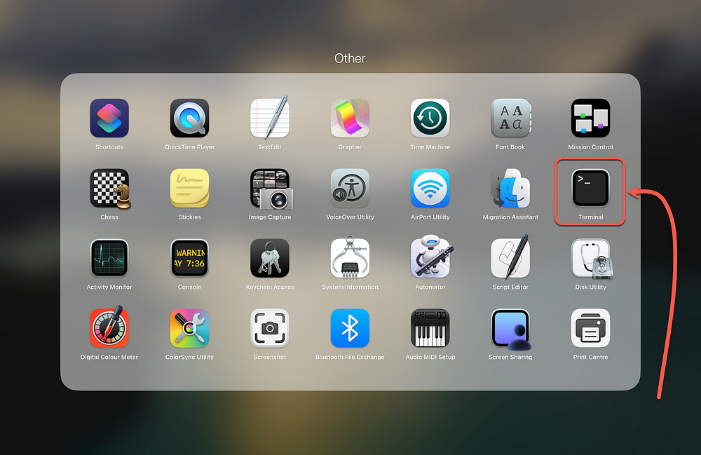 在你的电脑上打开 Terminal(终端)应用。下面是如何在 MacBook 上找到它的示意图: