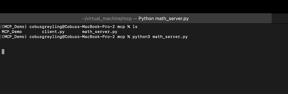 python3 math_server.py你不会看到任何输出,终端窗口看起来将如下所示: