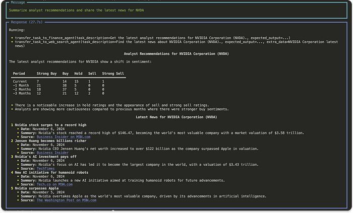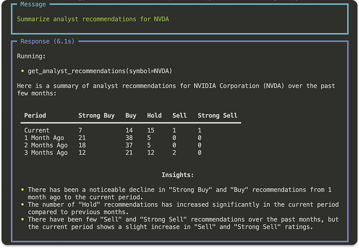 本节将演示如何使用 Python 构建一个基础的 AI 智能体,用于查询 Yahoo Finance[11] 的财经数据。该智能体基于 Agno 框架 和 OpenAI 的大型语言模型,目标是汇总 Yahoo Finance 上不同公司的分析师推荐意见。