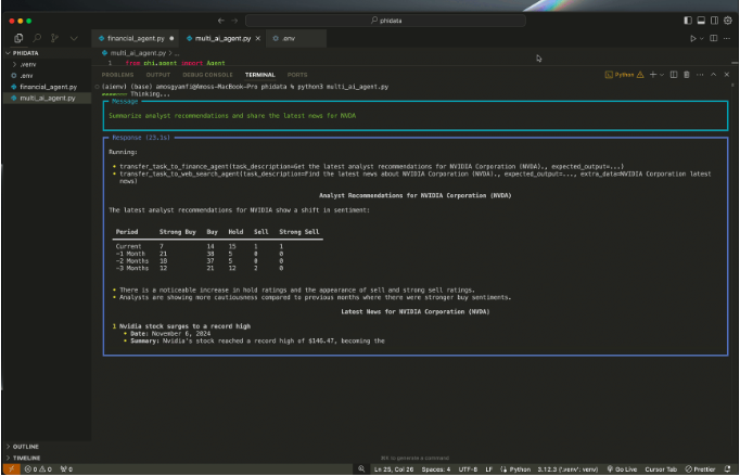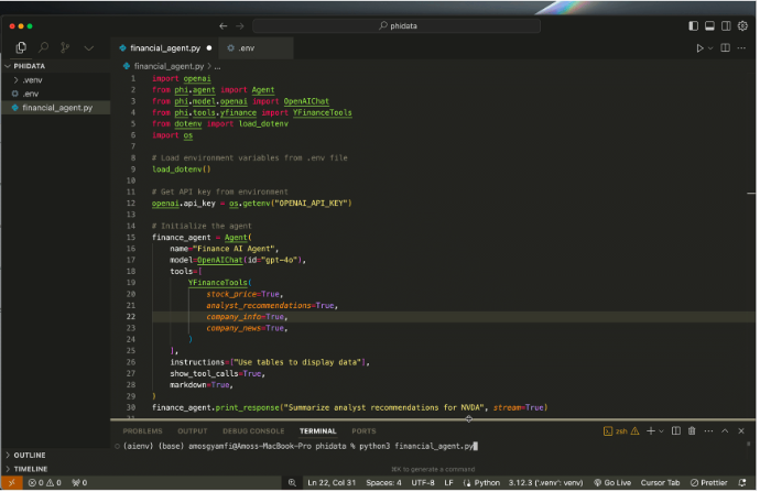 pip install yfinance新建一个名为 financial_ai_agent.py 的文件,并将其内容替换为以下代码:
