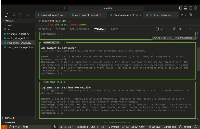 本示例中我们将在 Cursor AI 代码编辑器 中创建 Python 项目,但你也可以使用任何你喜欢的 IDE。请先创建一个空文件夹,并在 Cursor 中打开它。然后新建一个 Python 文件 financial_agent.py。接下来,在终端中使用以下命令设置虚拟环境: