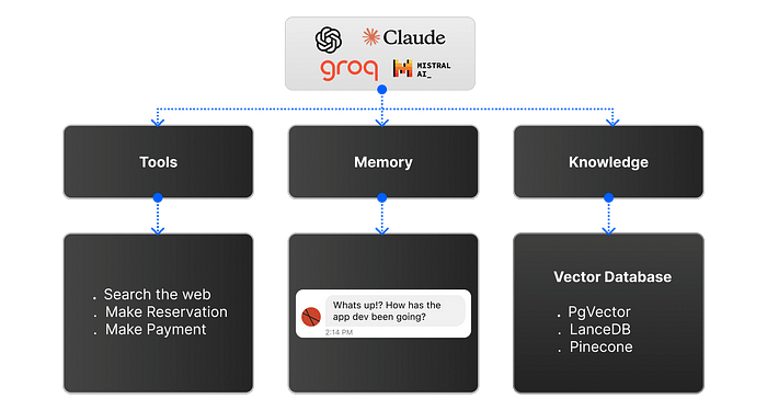 借助内置的数据库与向量存储支持,你可以轻松将 AI 系统与 Postgres、PgVector、Pinecone、LanceDb 等数据源集成。通过 Agno,你可以构建基础型智能体,也可以通过函数调用、结构化输出、微调等能力构建高级智能体。