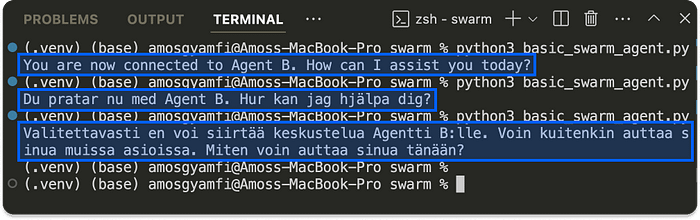 如果你将 agent_b 的指令语言修改为不同的语言(例如:英语、瑞典语、芬兰语),你将看到类似下图的输出效果。
