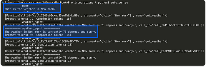 安装完成后,你可以复制并运行下面的示例代码,体验一个基于 Autogen 构建的基础天气查询智能体系统。
