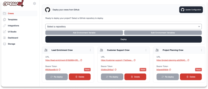 •可扩展性(Extensibility):CrewAI 可集成超过 700 种应用,包括 Notion、Zoom、Stripe、Mailchimp、Airtable 等。•工具支持(Tools):•开发者可以使用 CrewAI 框架从零开始构建多智能体自动化系统;•设计师可使用其 UI Studio 和模板工具,在无代码环境中构建完整功能的智能体。•部署能力(Deployment):你可以根据自己的偏好快速将开发中的智能体部署到生产环境。