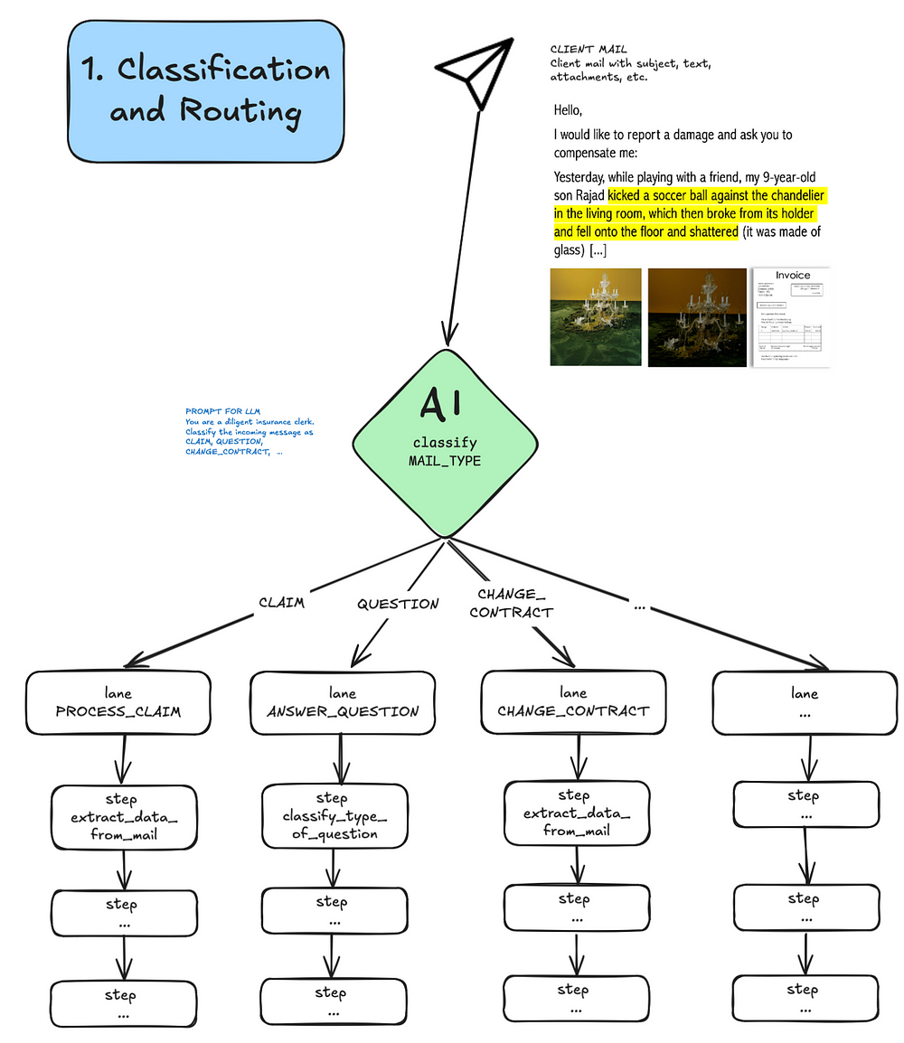 基于这一分类判断,系统会启动相应的处理路径(processing lane)。这一步往往不仅仅是函数调用[1],而是涉及到对整个流程的基本决策(例如属于哪一类理赔),后续触发多个独立的处理步骤。这就是智能体在流程第一步的职责,理解需求 → 分类判断 → 进入具体处理流。