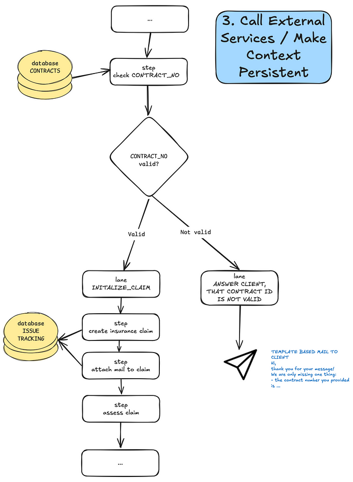 此外,为了使流程的上下文在当前会话之外仍然持续可用,智能体必须将数据写入系统或数据库。以我们的保险理赔智能体为例,它会根据合同号在客户数据库中查询客户信息,并将本次理赔请求的状态写入问题追踪系统(issue tracking system)。更进一步的是 —— 智能体具有“自主性(agency)”,它还可以主动向外部(例如客户)请求缺失的数据。