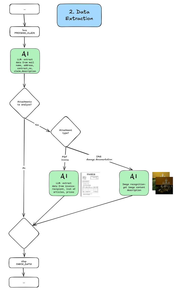 数据提取并不仅限于邮件正文中的文本内容,还可以包含图像、PDF 或其他文档中的数据。 为了完成这些任务,我们通常会结合多种模型使用:包括 LLM(大语言模型)、图像识别模型、OCR(光学字符识别)等。上文描述的流程其实是高度简化版。在现实中,我们通常会将图片发送给 OCR 系统,让它从扫描的发票或表单中提取文本;同时,我们也常常在分析前对附件进行分类处理。