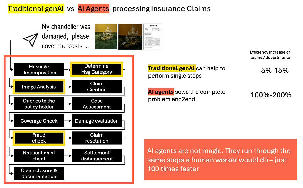 不同于传统的生成式 AI 系统,智能体不仅仅是对用户输入做出回应。它们能够处理一个完整且复杂的问题——例如,一起保险理赔案件——从头到尾自动完成。这意味着它们可以理解理赔中的文本、图片与 PDF;从客户数据库中检索相关信息;将案例与保险条款进行比对;主动向客户提问并等待回应——哪怕这个过程需要几天;且不会遗忘上下文。