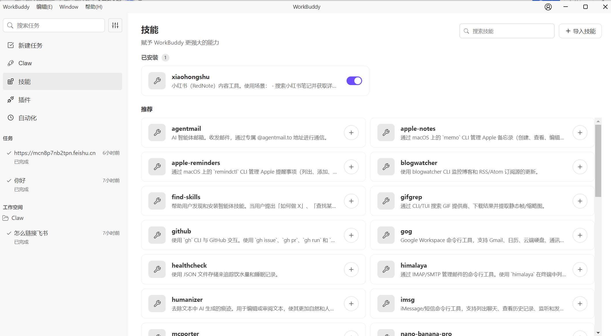 完成基础对接后,通过安装Skills(技能)与插件,可赋予WorkBuddy更强大的业务处理能力,使其不仅能对话,还能执行具体任务。