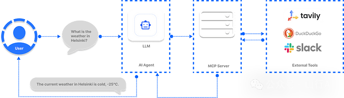 开发者通常提出的第一个问题就是:“MCP 是如何工作的?”MCP 的基本操作流程如下,用户向代理发送一个请求。代理判断应该调用哪个 MCP 服务器和工具,以获取执行该操作所需的相关信息。代理再利用某个具体工具返回的数据,来回应用户的请求。