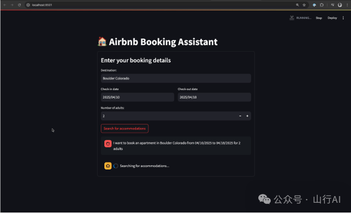 下列示例展示了如何将 Airbnb MCP 服务器 与 Praison AI 代理 结合,通过 Streamlit 页面 帮助用户在指定位置查找公寓。要创建你的第一个基于 Praison AI 的 MCP 代理,请先安装以下依赖项: