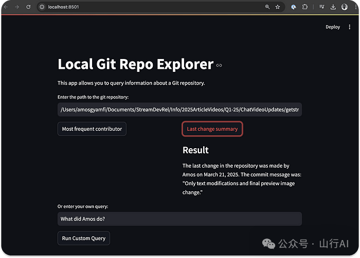 main_streamlit_app()上面的代码将 Streamlit 与 OpenAI MCP Agent 集成,借助 Git MCP 服务器,你可以通过自然语言与本地 Git 仓库进行“对话”。请先安装以下依赖包: