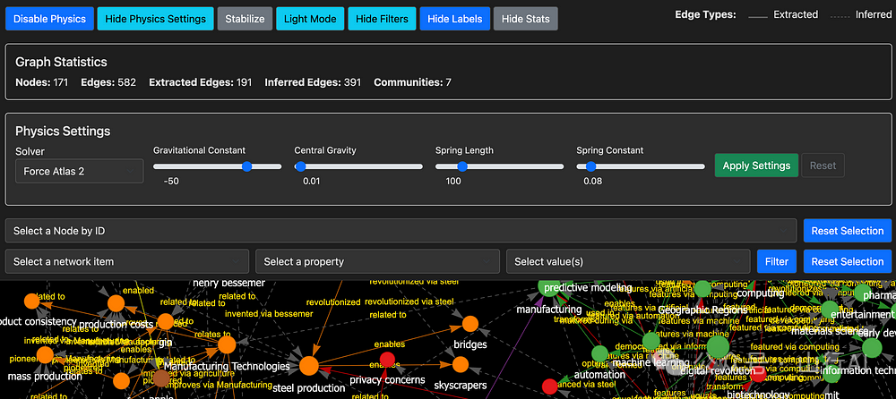 •颜色编码的社区:同一集群中的节点共享相同的颜色。集群通常映射到文本中的子主题或主题。•按重要性调整节点大小:具有多个连接(或较高中心性的)节点会显示得更大。•边样式:实线表示从文本中提取的关系,虚线表示推断出的关系。•互动控制:平移、缩放、拖动节点、切换物理引擎、切换明暗模式和过滤视图。