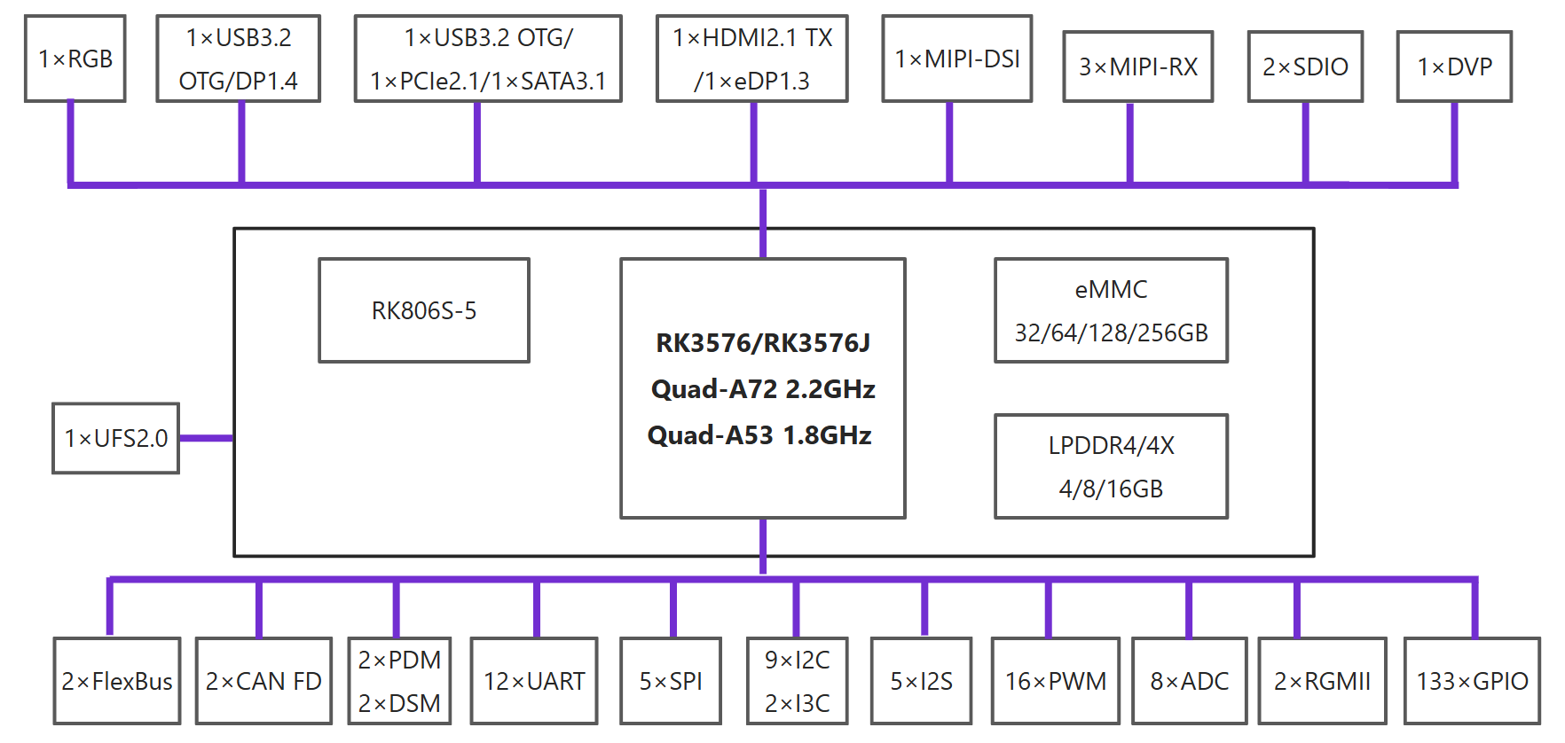 USB | 1 × USB3.2 Gen1 OTG0 (与DP1.4复用)1 × USB3.2 Gen1 OTG1 (与PCIe 2.1/SATA 3.1复用) |