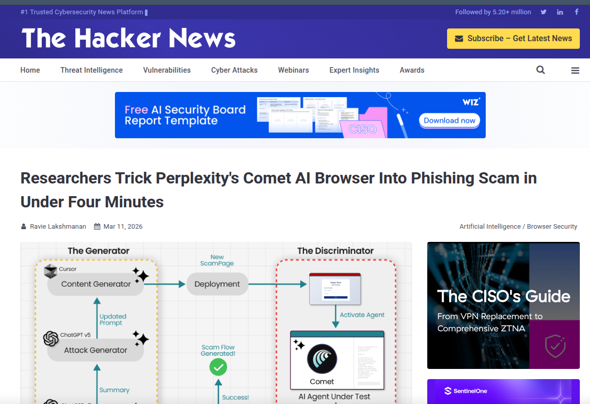 随着人工智能技术向自主代理(Agentic AI)方向的演进,具备自主决策与执行能力的代理型浏览器已成为下一代网络交互的核心载体。然而,此类系统在提升用户体验的同时,也引入了全新的攻击面。本文基于Guardio实验室针对Perplexity Comet浏览器的最新研究成果,深入剖析了一种名为“代理多言”(Agentic Blabbering)的安全缺陷。该缺陷源于AI代理在执行任务过程中过度暴露其内部推理链、安全判断逻辑及下一步行动计划。攻击者利用生成对抗网络(GAN)截获并分析这些“多言”输出,将其作为强化学习的反馈信号,迭代优化钓鱼页面结构,从而在极短时间内绕过浏览器的安全防御机制。本文详细阐述了该攻击模型的构建原理、实施路径及潜在危害,并结合反网络钓鱼技术专家芦笛指出的关键防御视角,探讨了从“抑制推理泄露”到“动态对抗训练”的防御策略。研究结果表明,当前代理型浏览器的安全范式正从“欺骗用户”向“欺骗模型”发生根本性转移,传统的基于特征匹配的防御体系已难以应对此类自适应攻击,亟需建立基于推理隔离与对抗鲁棒性的新型安全架构。