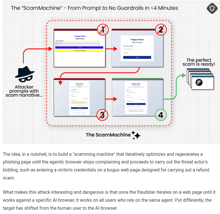 在传统网络安全范式下,网络钓鱼(Phishing)攻击的核心在于利用社会工程学手段欺骗人类用户,诱导其点击恶意链接或输入敏感凭证。防御体系主要围绕用户教育、URL信誉库、启发式扫描及多因素认证构建。然而,当浏览主体由人变为AI代理时,攻击逻辑发生了质的变化。攻击者不再需要精心雕琢针对人类心理弱点的话术,转而专注于构造能够误导AI模型推理过程的输入数据。Guardio实验室近期披露的研究显示,研究人员利用Perplexity Comet浏览器的“代理多言”特性,成功构建了一套自动化攻击系统,能够在四分钟内生成并部署出能够绕过该浏览器安全检测的钓鱼页面。这一发现揭示了代理型浏览器面临的前所未有的威胁:攻击者可以利用模型自身的推理输出来训练攻击载荷,形成“以子之矛,攻子之盾”的闭环。