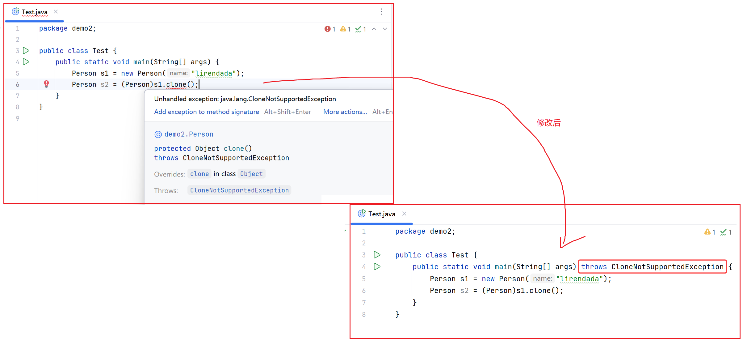 }注意事项:如果非 Person 类需要用到 Person 类的 clone() 方法,但没有实现 Cloneable 接口,则必须在使用了 clone() 方法的方法中处理 CloneNotSupportedException 异常,如下图所示:
