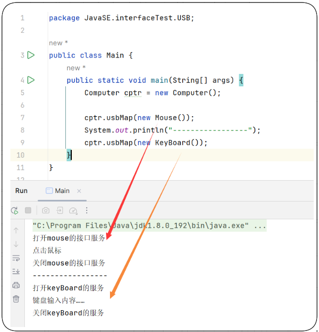 }下面我们就用一个文件一个类或者接口的编程方式,写一个 USB 接口,然后用鼠标类和键盘类来实现该接口的方法,接着用电脑类来向上转型,达到屏蔽底层实现的效果,代码如下所示: