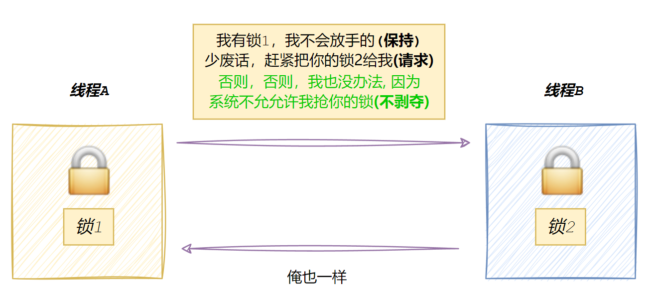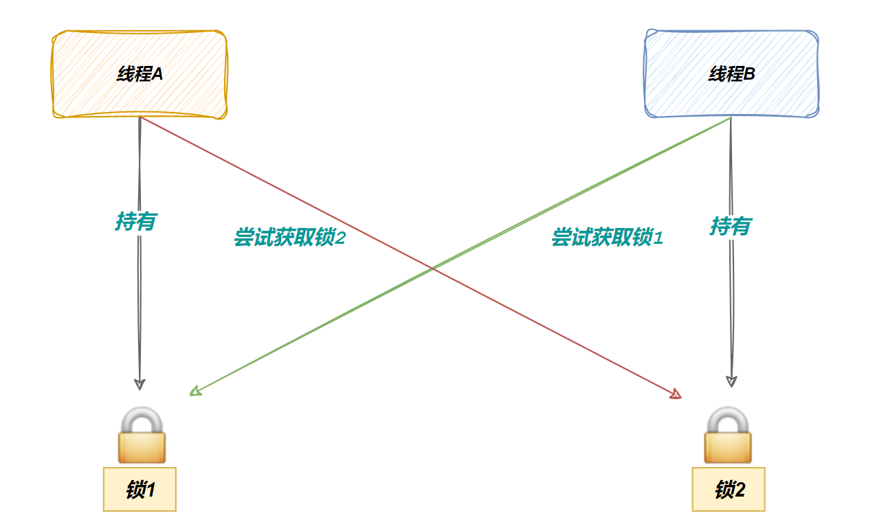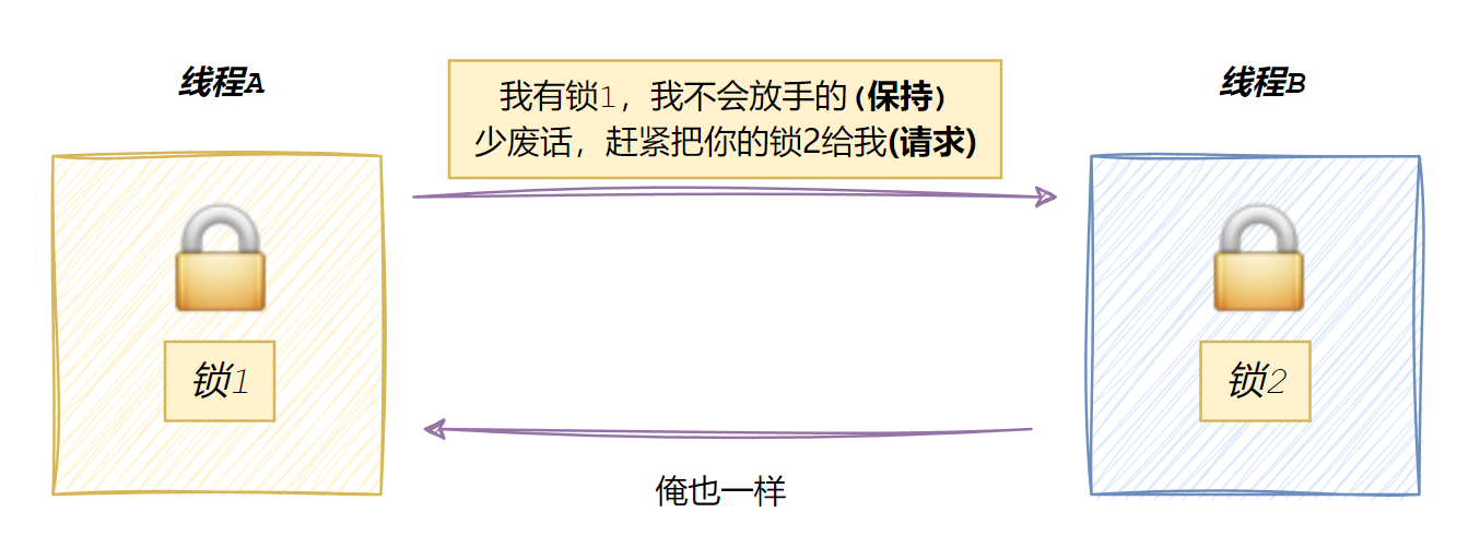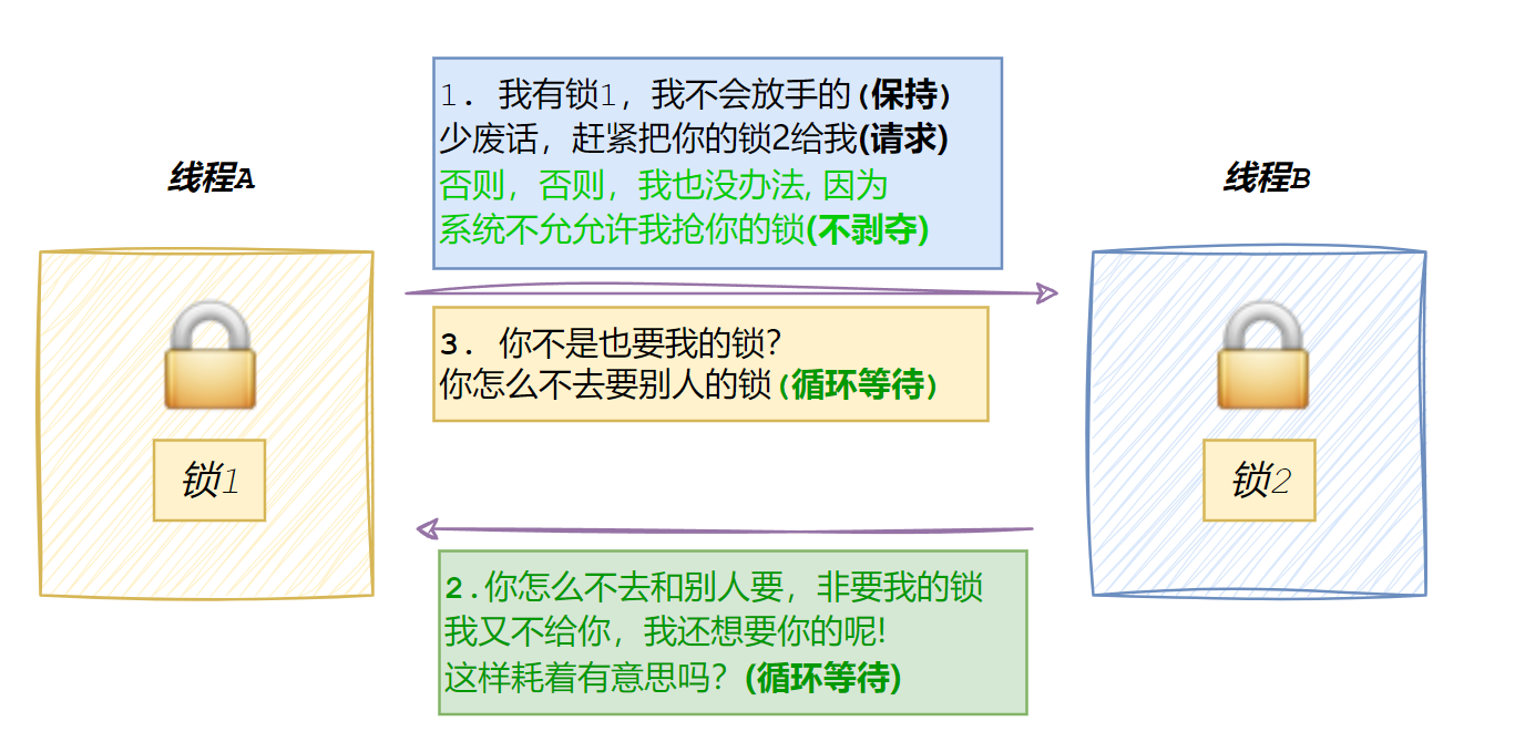 简单来说,死锁就是 “互相拿捏”:线程 A 持有锁 1,想要获取锁 2;线程 B 持有锁 2,想要获取锁 1,二者都不释放自己的锁,最终陷入无限等待。