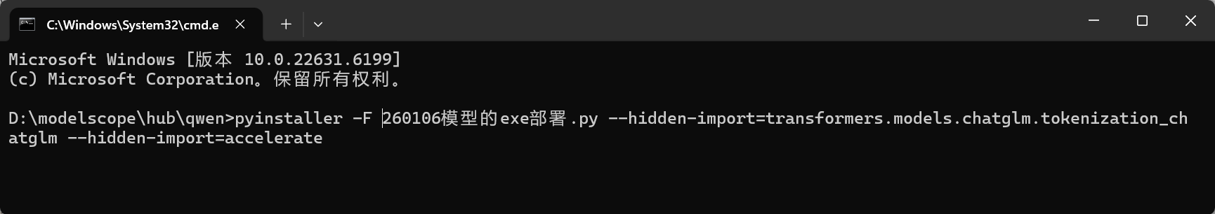 pyinstaller -F 260106模型的exe部署.py --hidden-import=transformers.models.chatglm.tokenization_chatglm --hidden-import=accelerate