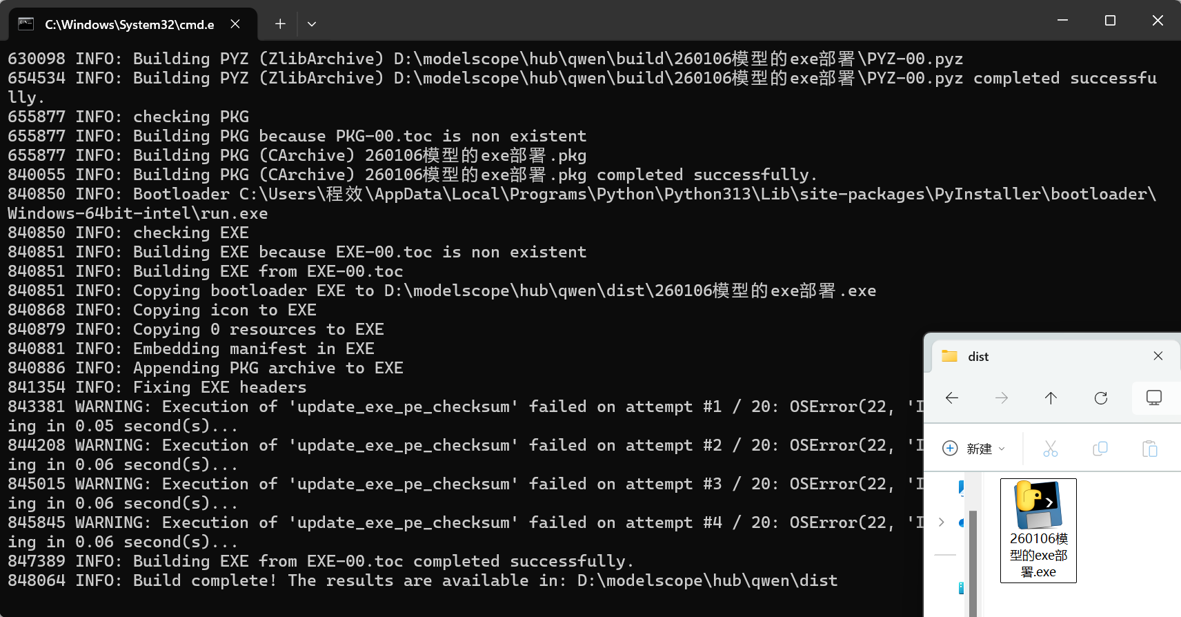 出现以下结果则说明打包已经完成,代码目录会生成 build、dist文件夹,EXE 文件在dist文件夹里,命名为"260106模型的exe部署.exe",文件大小依据Python 环境和依赖库的大小变化。
