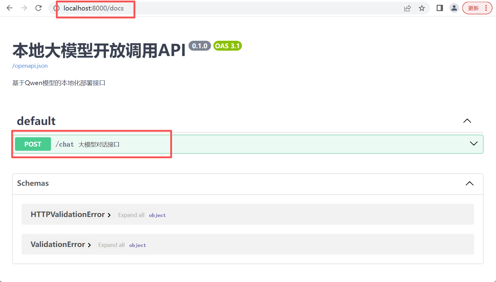 和之前一样:浏览器访问http://localhost:8000/docs即可调用模型;如果是服务器,用服务器 IP+8000 端口访问。