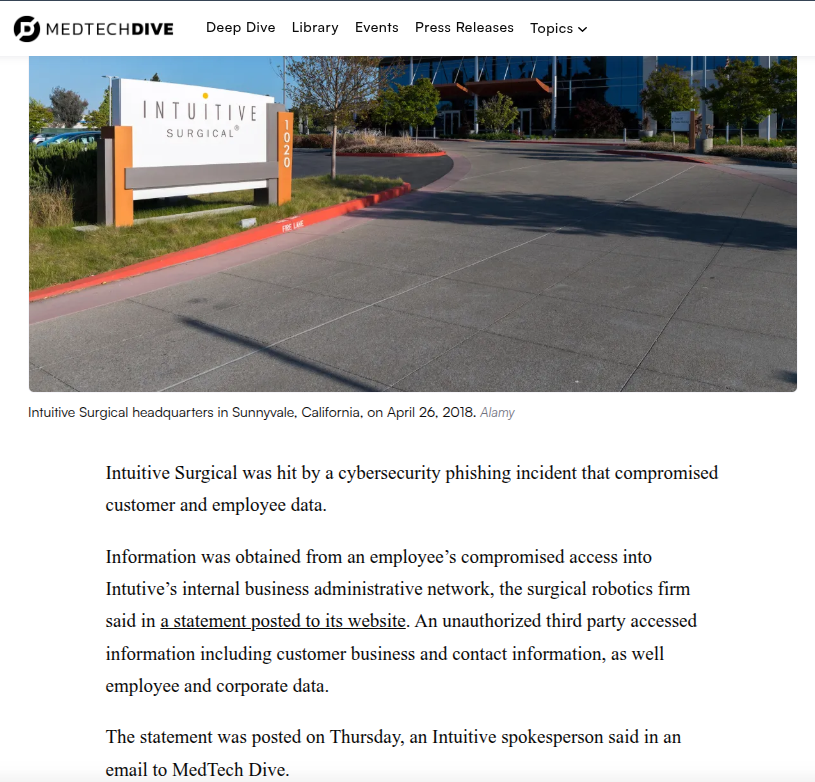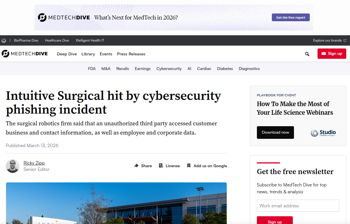 医疗行业的数字化转型正在以前所未有的速度推进,手术机器人作为这一进程中的皇冠明珠,极大地提升了手术的精准度与微创化水平。然而,高度的互联互通性也使其成为了网络犯罪分子的高价值目标。2026年3月,全球领先的手术机器人制造商直觉外科公司(Intuitive Surgical)遭遇了一起严重的网络安全事件。据MedTech Dive等权威媒体报道,该公司确认遭受了网络钓鱼攻击,导致部分内部IT系统被迫离线以遏制威胁蔓延。尽管公司迅速启动应急响应机制,声明患者数据未受泄露且手术服务未受实质性中断,但此次事件仍引发了业界对医疗设备供应链安全及内部网络防御体系的深刻反思。