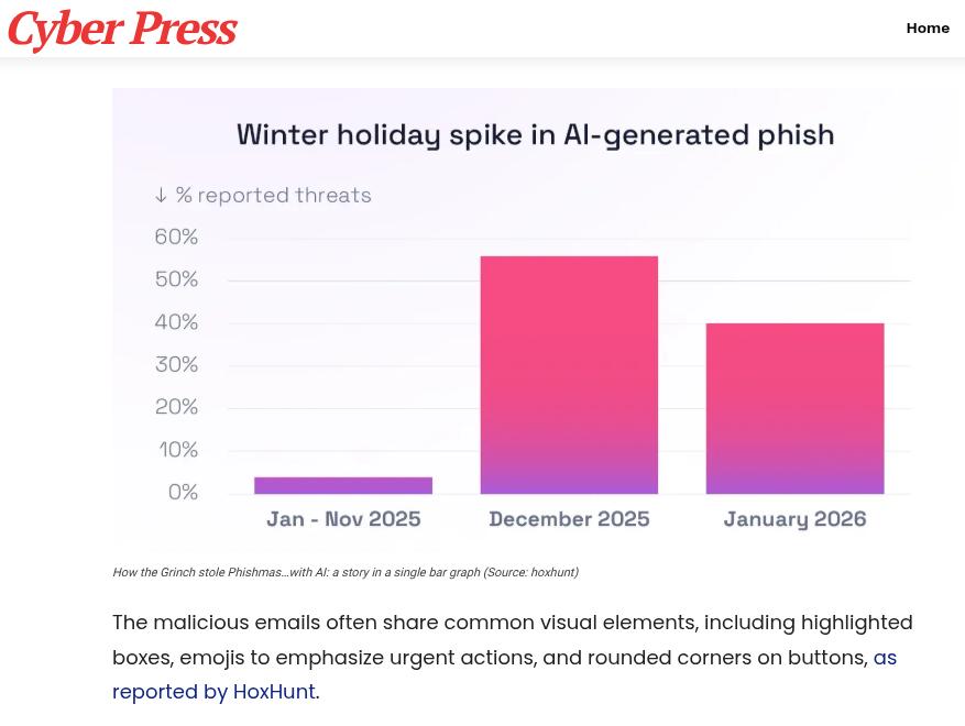 2025年的大部分时间里,AI生成的钓鱼攻击仅占月度钓鱼尝试的不到5%,尚属于边缘威胁。然而,进入2025年12月,威胁景观发生了戏剧性转折。据威胁分析机构记录, sophisticated AI-crafted emails的数量激增了14倍,在全球检测网络报告的各类攻击中占比高达56%。这一数据不仅标志着AI技术已从实验阶段走向规模化实战应用,更宣告了传统防御体系的全面失守。这些由AI精心打磨的邮件不再具备任何明显的低级错误,反而拥有 polished grammar(完美的语法)、formal language(正式的语言)以及slick graphics(流畅的图形),极易欺骗收件人。