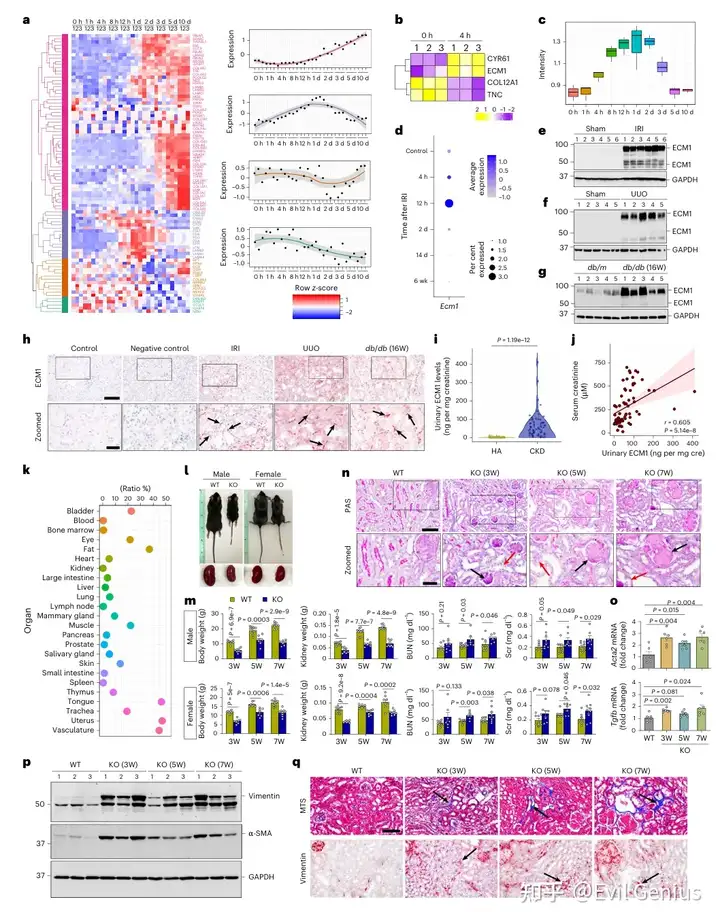 早期应答:ECM1作为ECM形成和细胞信号传导的关键蛋白,在肾脏损伤后迅速作出响应。