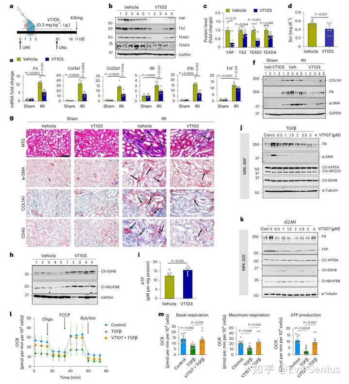 使用TEAD1棕榈酰化抑制剂VT103处理单侧IRI小鼠。结果显示,VT103显著降低YAP、TAZ及TEAD1/4蛋白水平,抑制YAP/TAZ-TEAD转录活性,并改善肾功能(Scr降低),下调纤维化相关基因(Fn、Col1a1、Col3a1)及促炎因子(Il6、Il1b、Tnf)表达,减少COL1A1、FN、α-SMA蛋白水平及胶原沉积,同时上调线粒体OXPHOS复合物并升高ATP水平。体外实验进一步证实,泛TEAD自棕榈酰化抑制剂VT107可有效抑制ECM1诱导的肾小管细胞去分化和TGFβ诱导的成纤维细胞活化,但选择性增强肾小管细胞(TCMK-1)的线粒体OXPHOS功能(基础呼吸、最大呼吸及ATP产生均显著增加),而对成纤维细胞OXPHOS影响微弱。该研究表明,靶向YAP-TEAD信号可通过差异性调控肾小管细胞能量代谢(增强OXPHOS)和成纤维细胞活化,从而缓解肾纤维化。