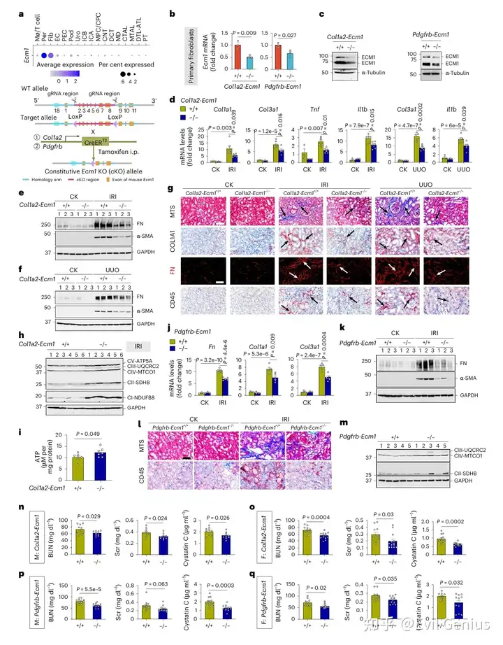为明确ECM1在成纤维细胞中的特异性作用,研究利用Cre-LoxP系统构建了两种他莫昔芬诱导的成纤维细胞特异性Ecm1条件性敲除小鼠(Col1a2-Ecm1⁻/⁻和Pdgfrb-Ecm1⁻/⁻),其表型与肾功能均正常。在单侧IRI或UUO模型中,两种cKO小鼠的肾脏ECM1表达均显著降低,并表现出纤维化相关基因(Acta2、Col1a1、Col3a1)和促炎因子(Tnf、Il1b)的下调,FN和α-SMA蛋白水平减少,胶原沉积和CD45⁺单核细胞浸润减轻。同时,cKO小鼠肾脏中线粒体OXPHOS复合物I-V表达上调,ATP水平升高。在28天双侧IRI模型中,两种cKO小鼠的肾功能指标(Scr、BUN、胱抑素C)均得到保护,FN表达降低。这些结果表明,成纤维细胞特异性敲除Ecm1可通过抑制炎症和纤维化、增强线粒体氧化磷酸化来缓解肾纤维化并改善肾功能。