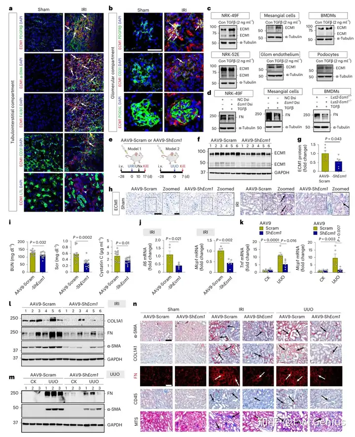研究通过双重免疫荧光染色明确了ECM1在肾脏中的细胞特异性表达模式:在缺血性损伤及阿霉素肾病模型中,ECM1主要定位于成纤维细胞、周细胞和肾小球系膜细胞,在巨噬细胞中弱表达,而在肾小管上皮细胞、内皮细胞和足细胞中几乎不表达;体外实验进一步证实,TGFβ可强烈诱导成纤维细胞和系膜细胞中ECM1的表达,但对肾小管上皮细胞、内皮细胞和足细胞无诱导作用,且敲低成纤维细胞/系膜细胞中的Ecm1或敲除巨噬细胞中的Ecm1均可显著抑制TGFβ诱导的纤连蛋白产生。体内功能实验显示,通过AAV9-shRNA介导的Ecm1敲低可有效减轻纤维化肾脏中的ECM1表达,改善缺血性CKD小鼠的肾功能指标(Scr、BUN、胱抑素C),降低促炎因子(IL-6、MCP-1、TNF-α)表达,并显著抑制肌成纤维细胞活化、胶原沉积、纤连蛋白积累及免疫细胞浸润,证实靶向Ecm1可多维度缓解肾纤维化进程。